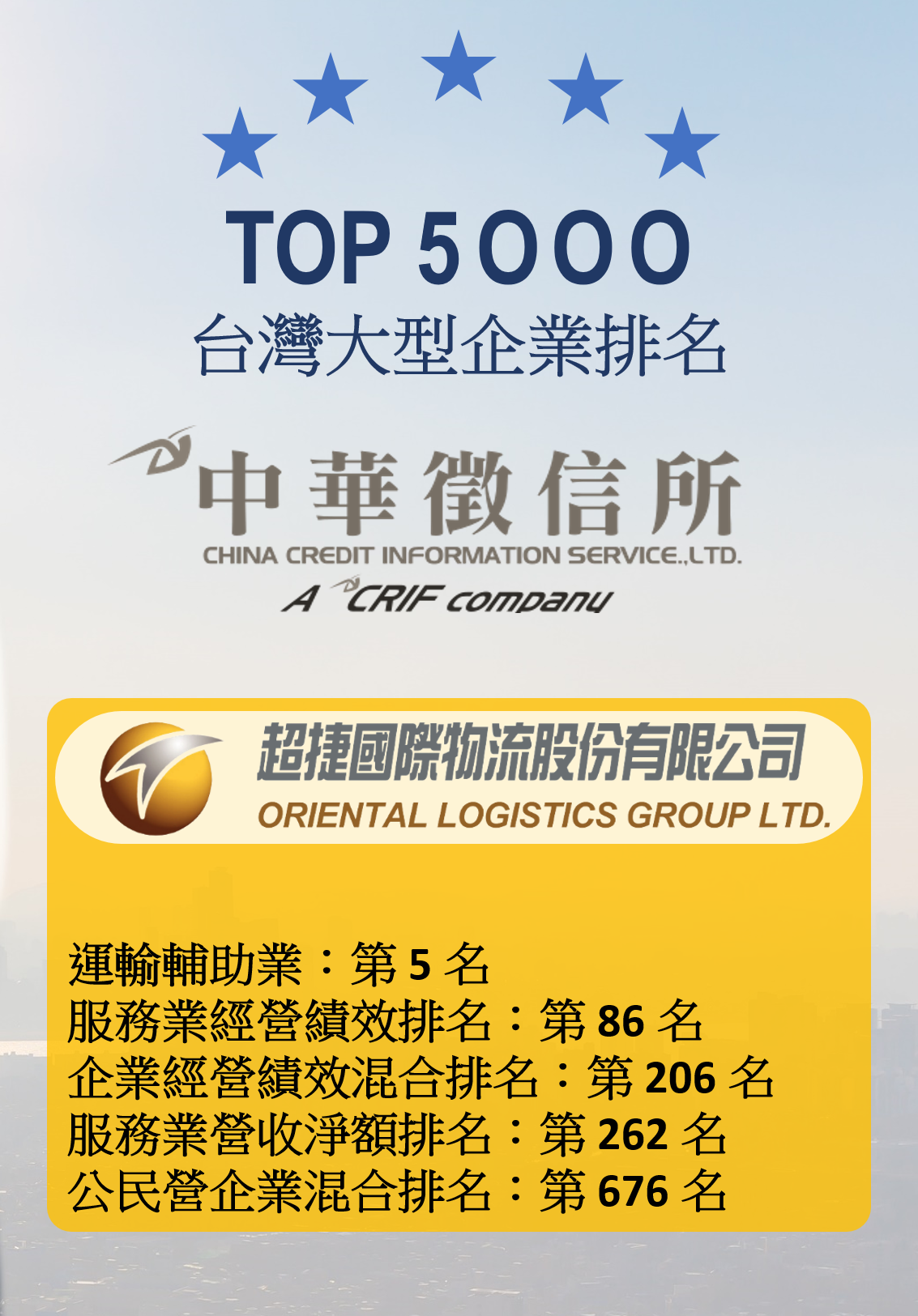中華徵信所臺(tái)灣大型企業(yè)TOP5000 2022年排名調(diào)查,超捷位列運(yùn)輸輔助業(yè)第5名,凸顯了在行業(yè)中的卓越地位和競(jìng)爭(zhēng)實(shí)力。在服務(wù)業(yè)經(jīng)營(yíng)績(jī)效排名方面,超捷取得第86名,提供高品質(zhì)的物流整合服務(wù),為客戶提供全面解決方案。企業(yè)經(jīng)營(yíng)績(jī)效混合排名為第206名,顯示了公司在多元業(yè)務(wù)領(lǐng)域中的全面實(shí)力,成功整合不同業(yè)務(wù)板塊,實(shí)現(xiàn)綜合績(jī)...